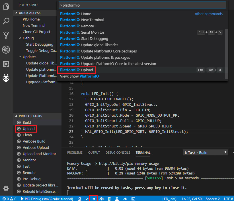 - با استفاده از منوی Task: Task... > PlatformIO: Upload یا از طریق کلیدهای میانبر cmd-alt-u/ctrl-alt-u