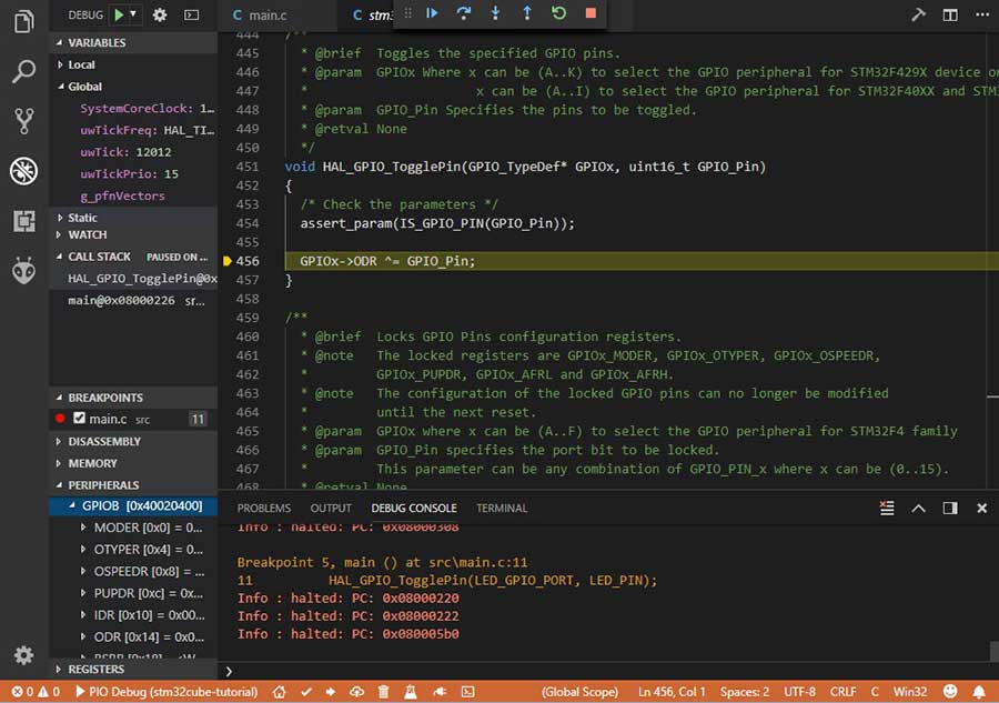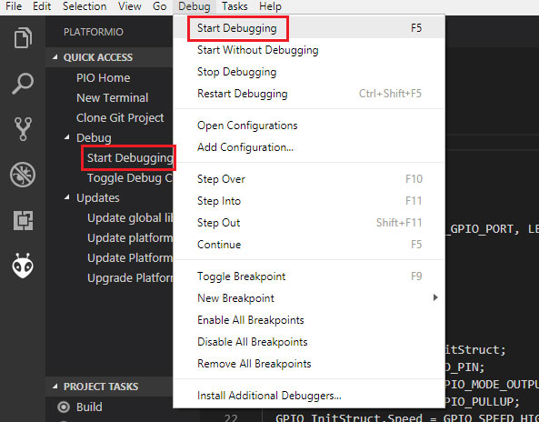 برای شروع اشکال زدایی می توانید از گزینه Start debugging در منوی دسترسی سریع PlatformIO ، یا از منوی بالا یا دکمه کلید F5 استفاده کنید.