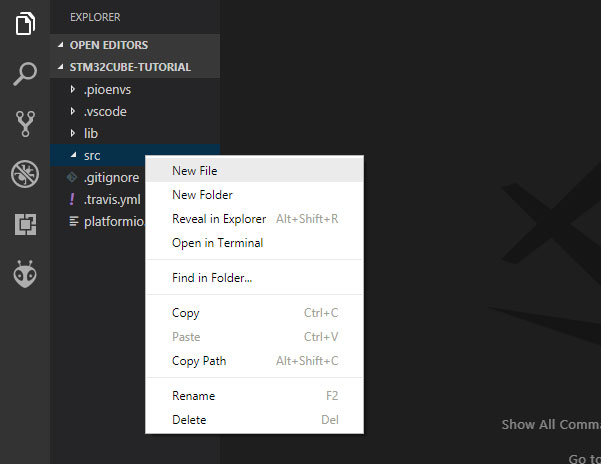 بریم کد اصلی را به پروژه اضافه کنیم. اولا، ما دو فایل اصلی main.c و main.h را در پوشه src_dir ایجاد می کنیم. بر روی src کلیک راست کنید