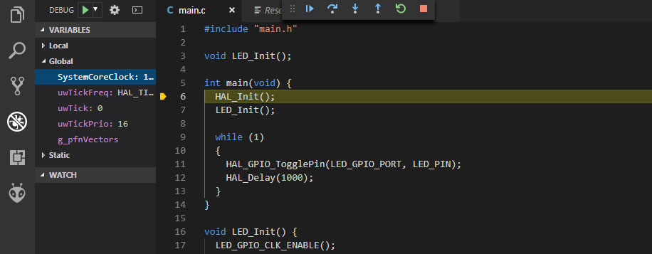 می توانیم با استفاده از دکمه های کنترل، کد را پیمایش کنیم، breakpoint ها را تنظیم کنیم، رجیستر های پریفرال ها را مشاهده کنیم، متغیرهایی را به پنجره Watch اضافه کنیم: