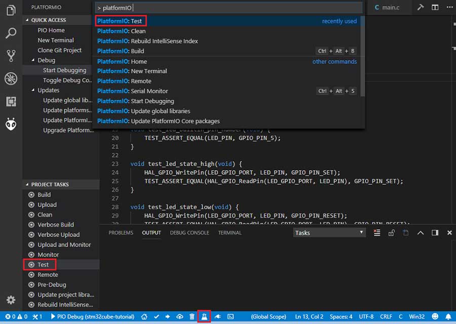گزینه Test از منوی بالا یا دکمه Test در PlatformIO Toolbar استفاده کرد