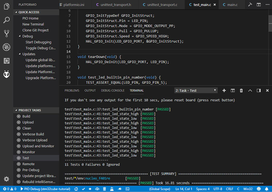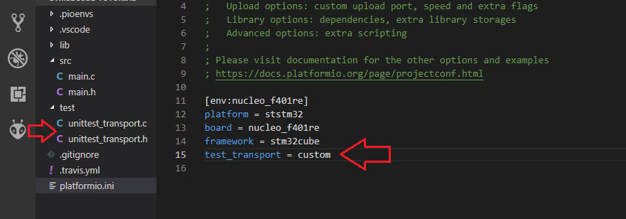 خب حالا بریم تست هایی را با استفاده از ویژگی تست واحد PIO بنویسیم که می تواند به ما کمک کند تا کد را مستقیماً روی برد آزمایش کنیم. موتور PIO Unit Testing به طور پیش فرض تنها از سه فریموورک پشتیبانی می کند: Arduino ، ESP-IDF ، Mbed و از آنجا که تصمیم گرفتیم از STM32Cube استفاده کنیم، برای چاپ نتایج آزمایش باید یک test_transport سفارشی را پیاده سازی کنیم و آن شرایط را درplatformio.ini (فایل پیکربندی پروژه) مشخص کنیم:
