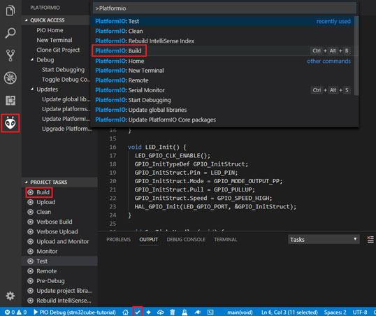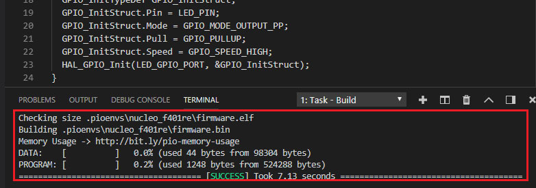 - با استفاده از منو Task: Task... > PlatformIO: Build یا از طریق کلیدهای میانبر cmd-alt-b/ctrl-alt-b