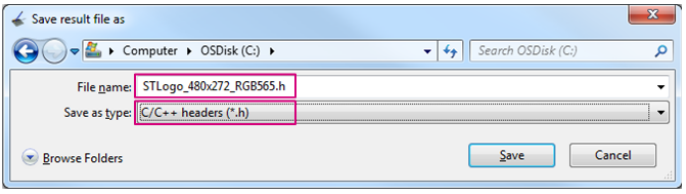 حالا با توجه به فرمت ورودی پیکسل پیکربندی شده LTDC لایه RGB565، فایل هدر را ایجاد میکنیم.