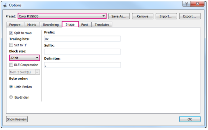 در پنجره Options که در شکل زیر نشان داده شده است، تب Image را انتخاب کرده و سپس رنگ RGB565 را در قسمت Preset_field انتخاب کنید. قسمت Block size را روی 32 بیتی تنظیم کنید و بر روی دکمه OK کلیک کنید.