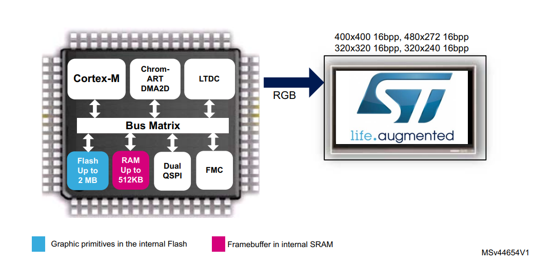 شکل زیر یک نمونه پیاده سازی گرافیکی را نشان می دهد که در آن دو حافظه خارجی به یک میکروکنترلر STM32 متصل می شوند، یکی برای فریم بافر و دیگری برای عناصر اصلی گرافیکی.