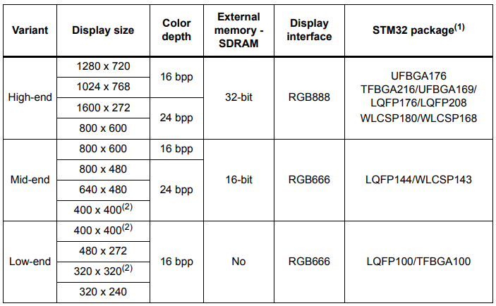 - Package availability of STM32 MCUs embedding LTDC is summarized in Table 17