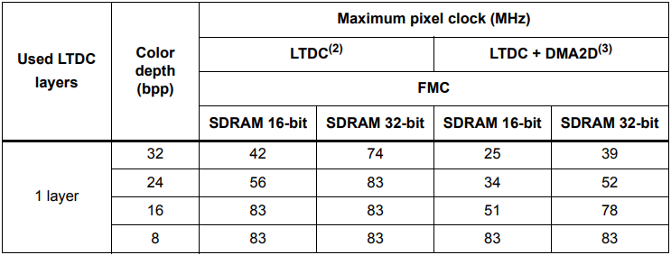 با توجه به جدول زیر در ستون LTDC + DMA2D و ردیف یک لایه، pixelclock می تواند برای SDRAM شانزده بیتی به 34 مگاهرتز برسد.