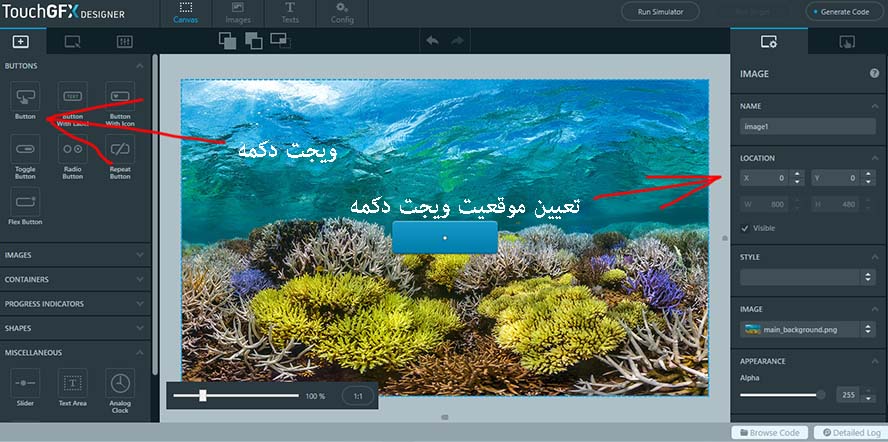 حالا با کلیک روی ویجت Buttonدر تب ویجت ، دکمه ای به صفحه اضافه کنید. ویجت جدید را با کشیدن آن با ماوس حرکت دهید. برای تنظیم دقیق موقعیت ویجت ها می توانید از دکمه های کوچک بالا / پایین X و Y در پروپرتی استفاده کنید.