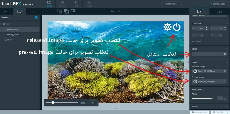 سپس تصویر را برای released image (هنگامی که دکمه فشرده نیست) Power_48_dark.png و برای حالت pressed image (هنگامی که دکمه فشرده می شود) Power_48_light.png انتخاب کنید.