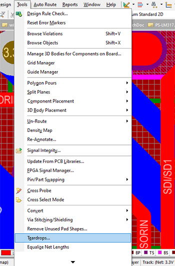 ابتدا وایا و پدهایی رو که می خواهید Teardrop شوند را انتخاب کنید برای این کار Shift را نگه داشته و بعد آنها را انتخاب کنید. بعد Tools »Teardrops از منو انتخاب کنید. یا با دکمه ترکیبی T+e
