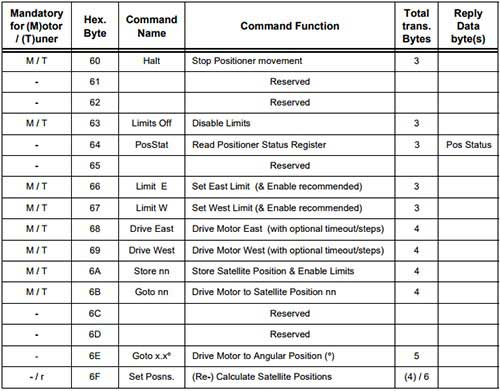 6B: هربار که ماهواره را عوض می کنیم این دستور به همراه شماره ماهواره ارسال می شود مثلا E0 31 6B 02 یعنی پوزیشنر، دیش را به سمت ماهواره شماره 2 حرکت دهد و وقتی به آن رسید متوقف شود.