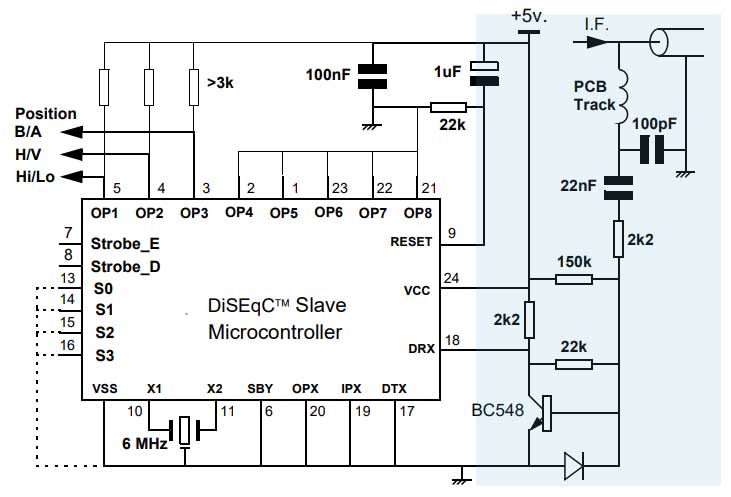 مدار زیر مدار DiSEqC یکطرفه (فقط-دریافت بدون قابلیت پاسخ) را نشان می دهد، همانطور که ممکن است در (LNB) یا سوئیچر استفاده شود. با این وجود، استفاده از میکروکنترلر پوزیشنر در حالت فقط-دریافت امکان پذیر است، اما برای اجرای قابلیت پاسخ به چند عنصر دیگر هم نیاز است، بنابراین توصیه نمی کنیم مدار فقط-پاسخ استفاده شود در عمل برای کمک به درک مدارات پایه در اینجا گنجانده شده است.