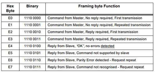 بایت فریم هم یکی از مقادیر در جدول زیر است. به طور معمول دستگاه پوزیشنر یکطرفه (بدون قابلیت پاسخ) باید طوری طراحی شود که پیام های دریافتی از رسیور که فریم آنها E0 و E1 باشد را ترتیب اثر دهد.