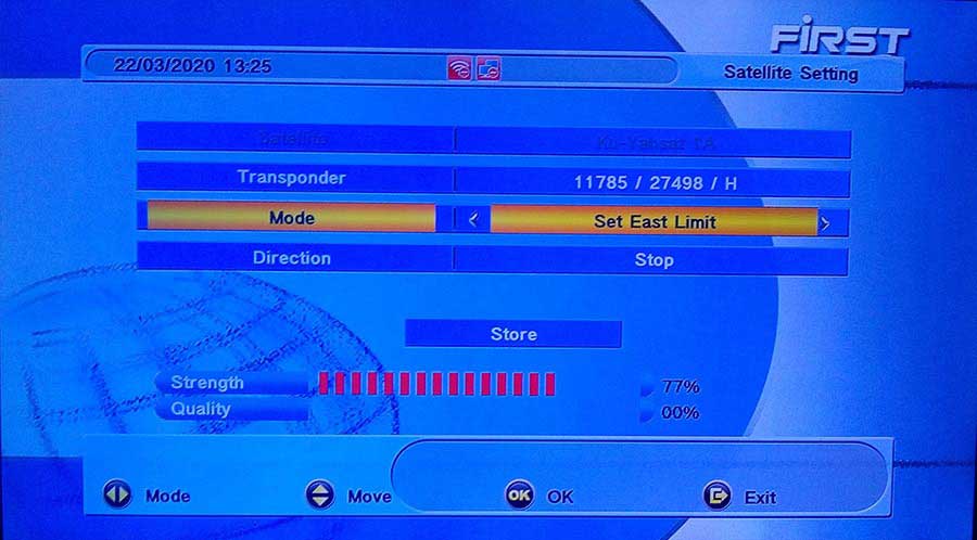 ابتدا وارد منو تنظیمات رسیور برای دیش گردان شده قبل از همه حد شرقی و غربی را ذخیره کرده برای این کار موتور را تا جایی که دیگر بسته نشود (هارد لیمیت) از سوی رسیور یا با دکمه East روی پوزیشنر حرکت دهید حالا در منو Set East Limit را ذخیره کرده با این عمل سافت لیمیت هم فعال می شود این بار موتور را تا جایی که دیگر باز نشود (هارد لیمیت) از سوی رسیور یا با دکمه West روی پوزیشنر حرکت دهید حالا در منو Set West Limit را ذخیره کنید.