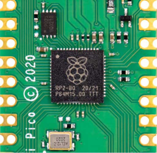 تراشه RP2040 یک پردازنده دو هسته ای +Cortex-M0 با حافظه فلش 2 مگابایتی، 264 کیلوبایت حافظه SRAM و کلاک 133مگاهرتز است.