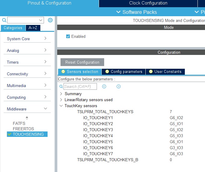 حالا برای استفاده از کتابخانه TSL در برنامه به قسمت Middleware رفته تیک Enable را بزنید تا فعال شود و در تب Sensor Selection نوع سنسور (proximity، touchkey ، linear و rotary) که در این پروژه ما touchkey استفاده می کنیم و پین های مربوط به آن را مانند شکل زیر وارد می کنیم.
