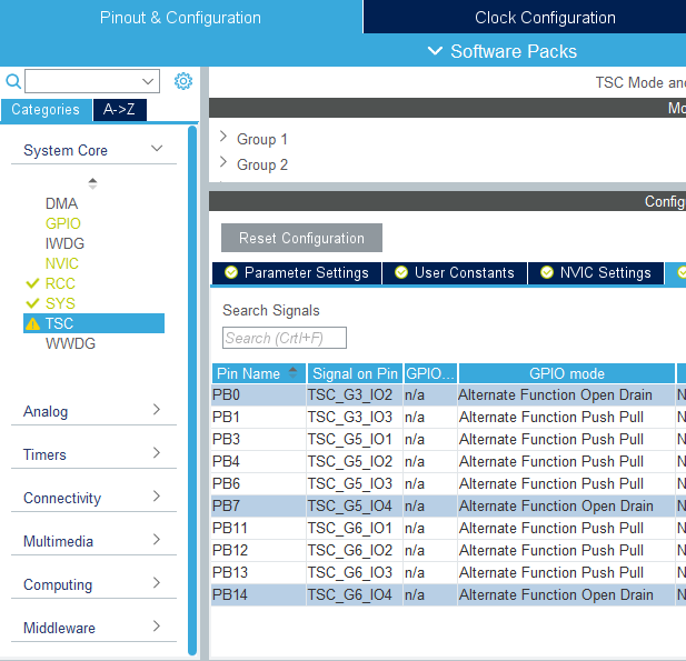 در قسمت تنظیمات GPIO پین مربوط به خازن نمونه برداری CS باید در حالت alternate output open-drain تنظیم شود که در شکل زیر نشان داده شده است. ما در این پروژه پین های PB0, PB7, PB14 را برای خازن نمونه برداری CS انتخاب کرده ایم پس آنها در حالت alternate output open-drain تنظیم می شوند. علاوه براین، برای جلوگیری از مصنوعات، باید Schmitt trigger hysteresis غیرفعال شود.
