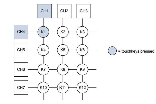 اما چون در این پروژه قرار است کلید ماتریسی لمسی 3x4 بسازیم آن را طوری طراحی کرده ایم که حداکثر هفت پین ( و نه 12 پین) میکرو را اشغال کند و این به این معنی است که هر تاچ توسط کاربر باعث لمس دو پین کنار هم خواهد شد.