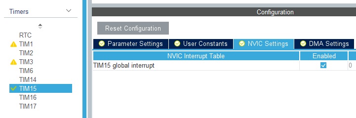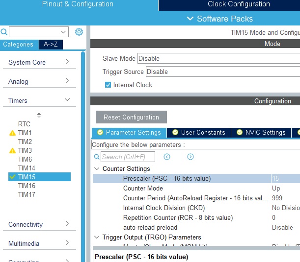 در انتها تایمر 15 را به همراه وقفه فعال کرده که در ادامه خواهیم دید که کجا از آن استفاده می کنیم. تیک Internal Clock را بزنید و تقسیم کننده و مد شمارنده و دوره شمارنده را مانند شکل زیر تنظیم کنید.