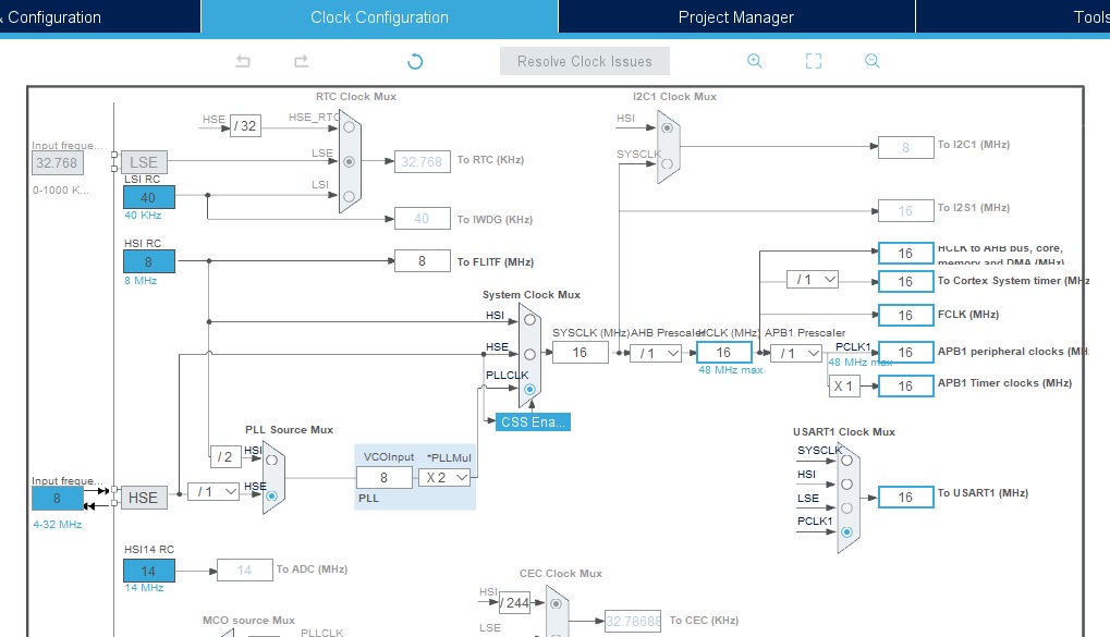 در قسمت کانفیگ کلاک Clock Configuration فرکانس کلاک و قسمت های دیگر مانند شکل زیر تنظیم کنید.