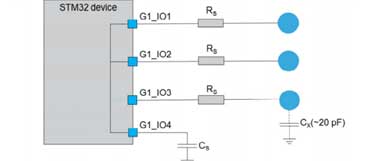 هر یک از آنها از طریق یک مقاومت سری (RS) به یک الکترود حسگر متصل می شوند. RS برای بهبود ESD استفاده می شود. در یک گروه I/O آنالوگ، فقط یک کانال به طور همزمان قابل دستیابی است. این بدان معناست که اگر سه کانال اجرا شوند، برای سه حسگر به صورت متوالی خواهد بود.