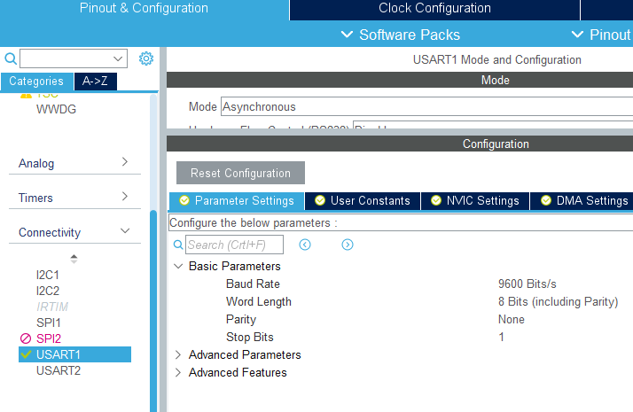 در قسمت تنظیمات connectivity وارد بخش USART1 شوید و Baud Rate ارتباط سریال را 9600 وارد کنید.