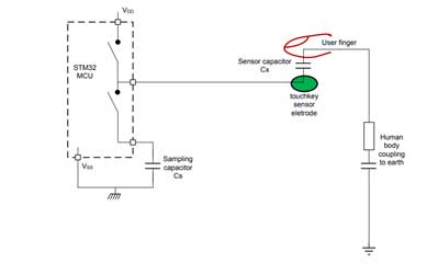 touch sensing در STM32 مبتنی بر انتقال شارژ است. اصل charge transfer شامل شارژ خازن سنسور Cx و انتقال بار جمع شده به خازن نمونه برداری Cs است. این سیکل تا زمانی که ولتاژ در Cs به VIH برسد تکرار می شود.