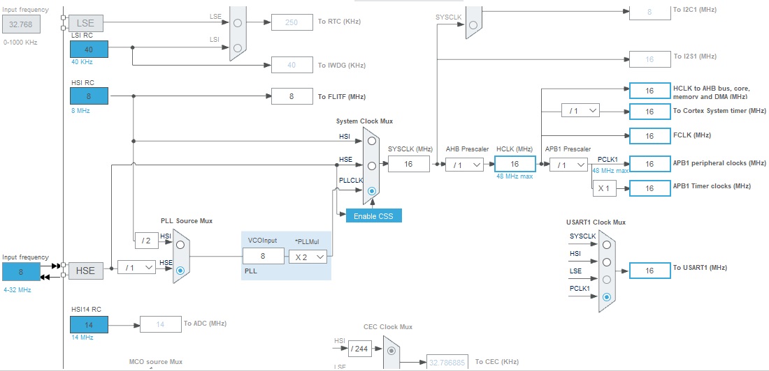 4- همچنین کلاک سرعت بالا را روی کریستال تنظیم می کنیم و در بخش Clock Configuration سرعت کلاک در بخش های مختلف مانند شکل زیر باشد